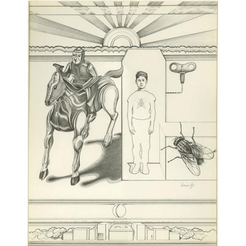 <B>LORRAINE FOX (American 1922-1976)</B></I><BR>Original Illustration<BR><I>Untitled (Surrealist Composition)</B></I><BR>Pencil on board<BR>16.5 x 21in. (image size)<BR>Signature below insect image<BR> 1 Items <BR><BR><B>Condition Report:</B> In excellent condition