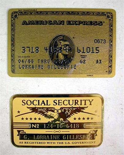 LORRAINE GILLESPIE'S LEATHER WALLET AND PASSPORT HOLDER Together with various credit/membership cards including an American Express Gold Card, a metal Social Security card, and several Song Writers Guild of America membership cards