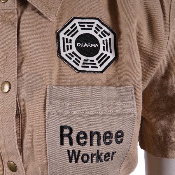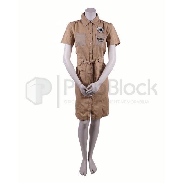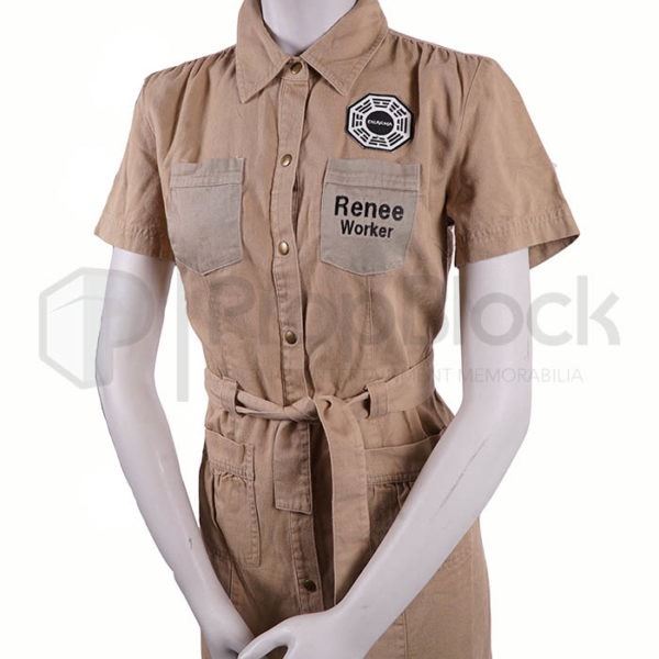 Tan dress worn as a work uniform by a Dharma Initiative female employee on the mysterious island where ABC’s LOST takes place. The dress has several pockets, a tie on belt, and front snap closures. Production has replaced the chest pockets and the left pocket has the words ‘Renee’ and ‘Worker’ embroidered on it. The dress also has a production-made Dharma Initiative embroidered logo patch sewn onto the left chest. Written inside the collar is ‘Alice Forsyth’ in black ink. No size information is available.