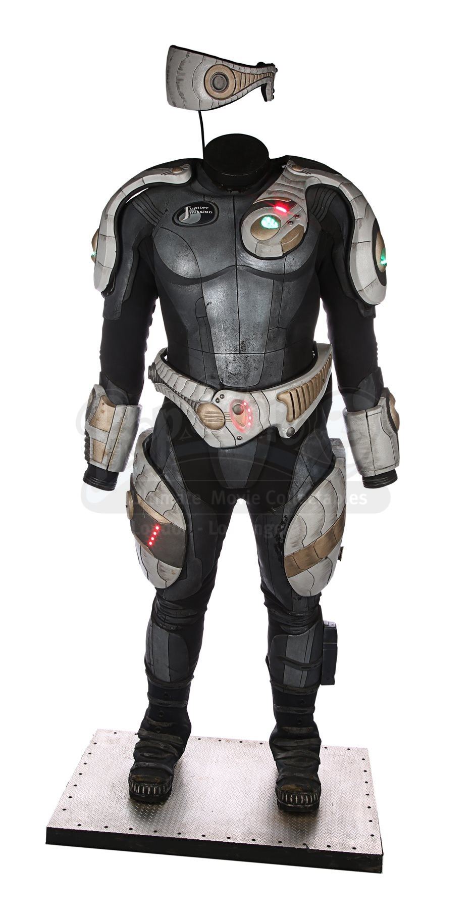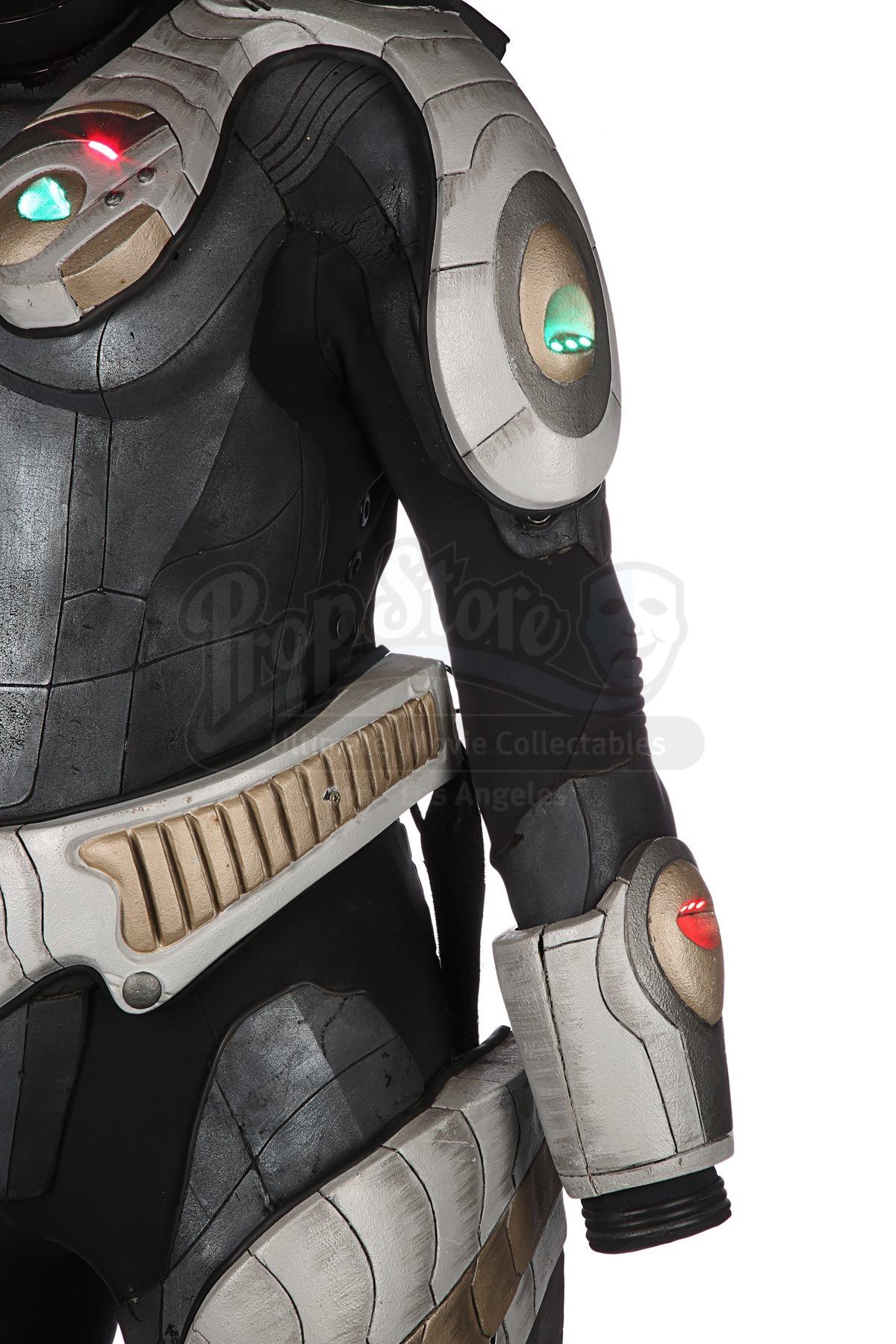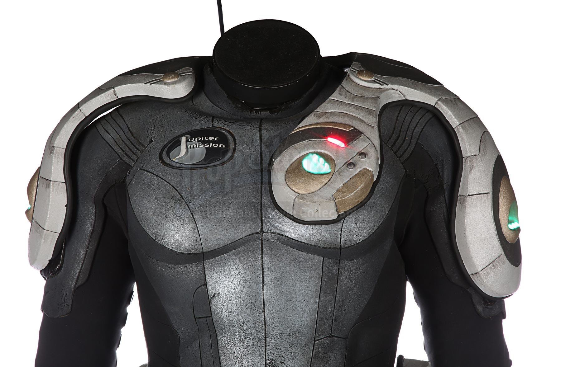 The underlayer of the costume consists of a wetsuit made from black material, with rubber panels secured to the exterior, finished in varying shades of grey. Panel line detailing is present to add to the dynamic appearance of the suit. A resin badge reading “Jupiter Mission” decorates the right breast. Asymmetrical vac-formed pieces finished in light grey and faux gold are adhered to the left side of the chest, shoulders, waist, wrists and upper thighs. The suit is completed by a pair of black thick soled boots and a matching visor.