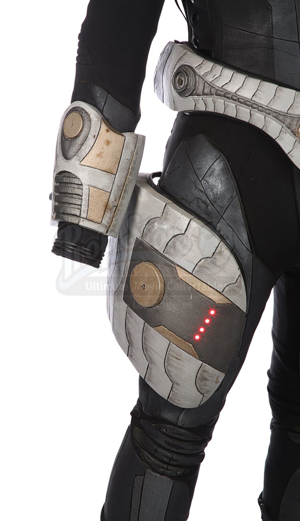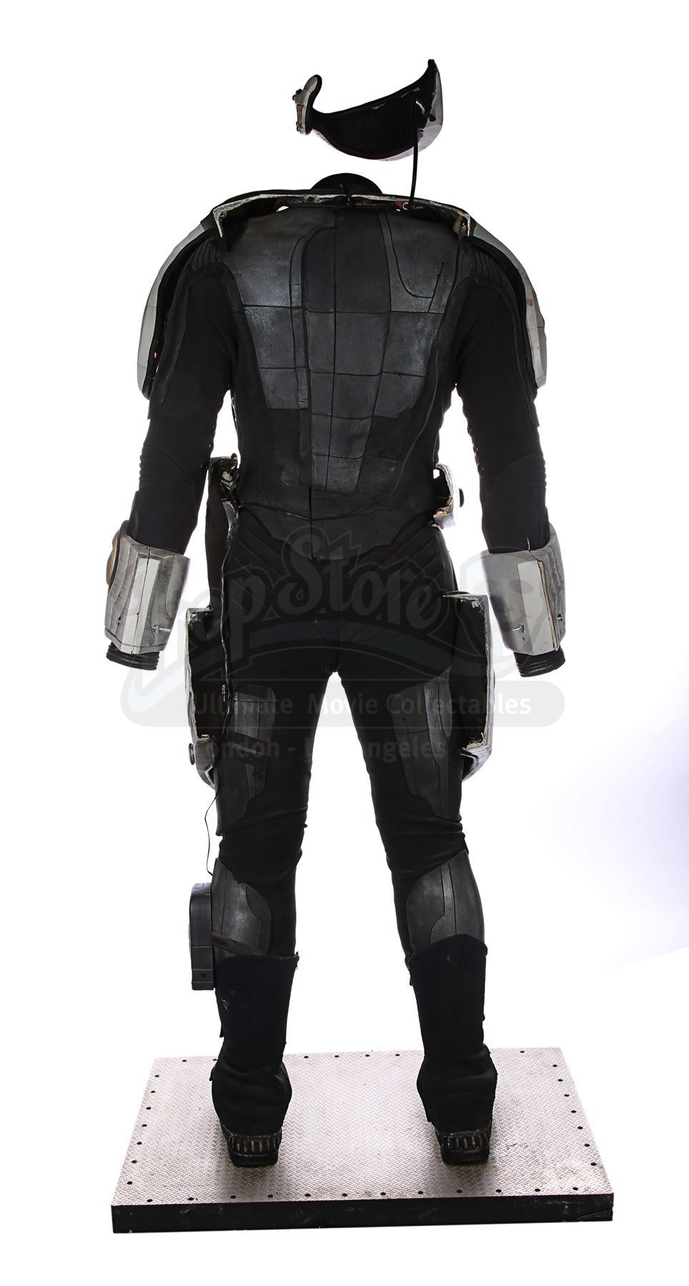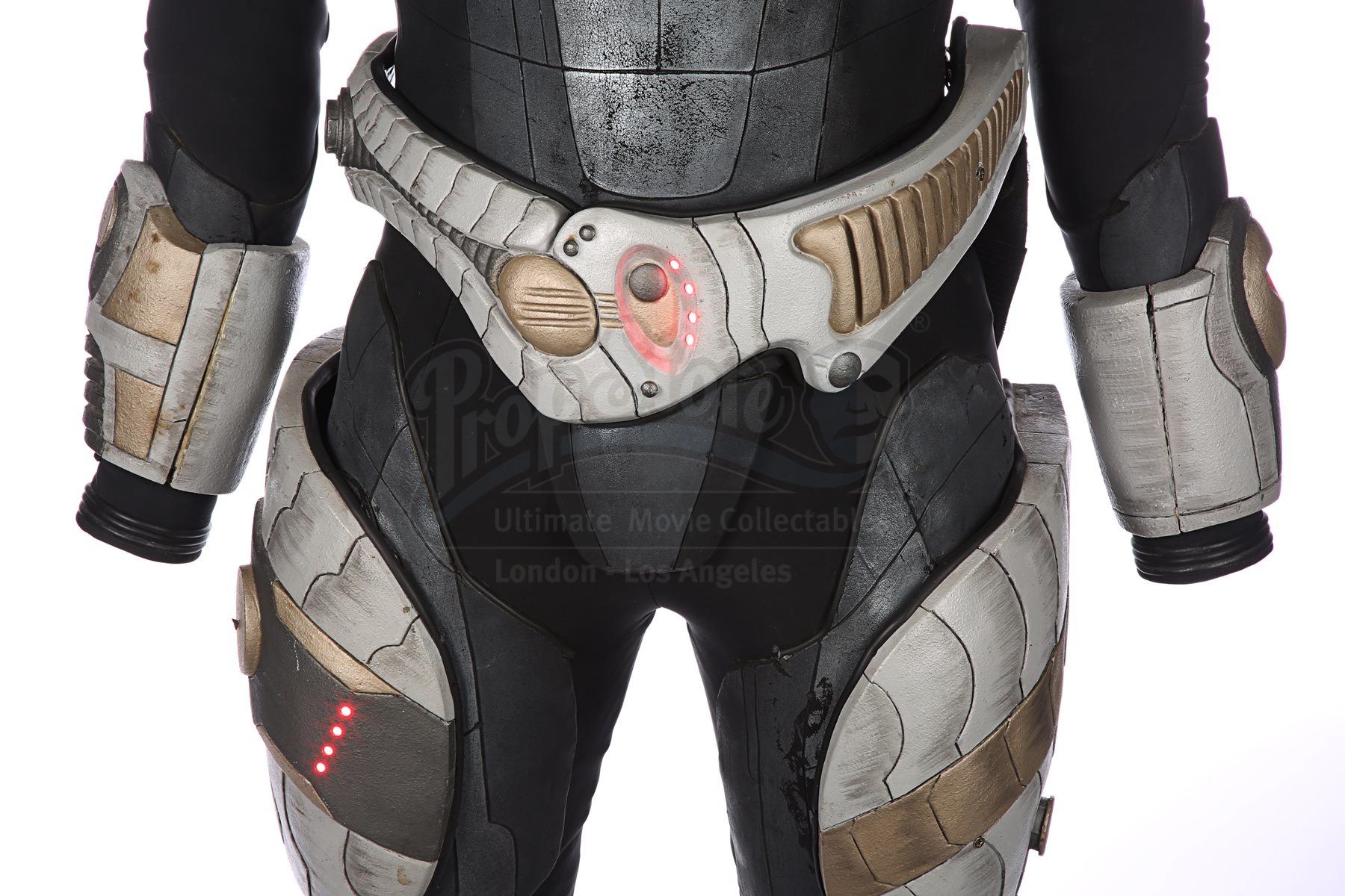 Cast-in detailing and a combination of small red and green LEDs are incorporated into the plastic pieces, powered by a 6-volt plug located in a compartment on the left side of the suit’s custom-made mannequin display. The display has a chromed tread-plate base. The rubber elements of the costume show minor wear. Dimensions (suit display): 34 cm x 65 cm x 167 cm (13 ½” x 25 ¼” x 63”)