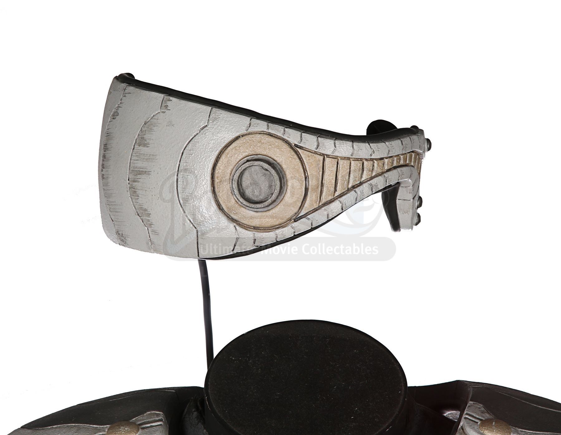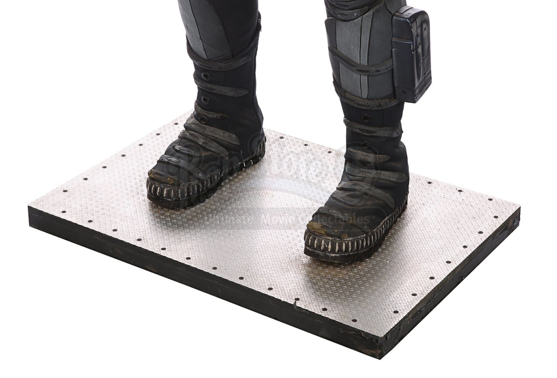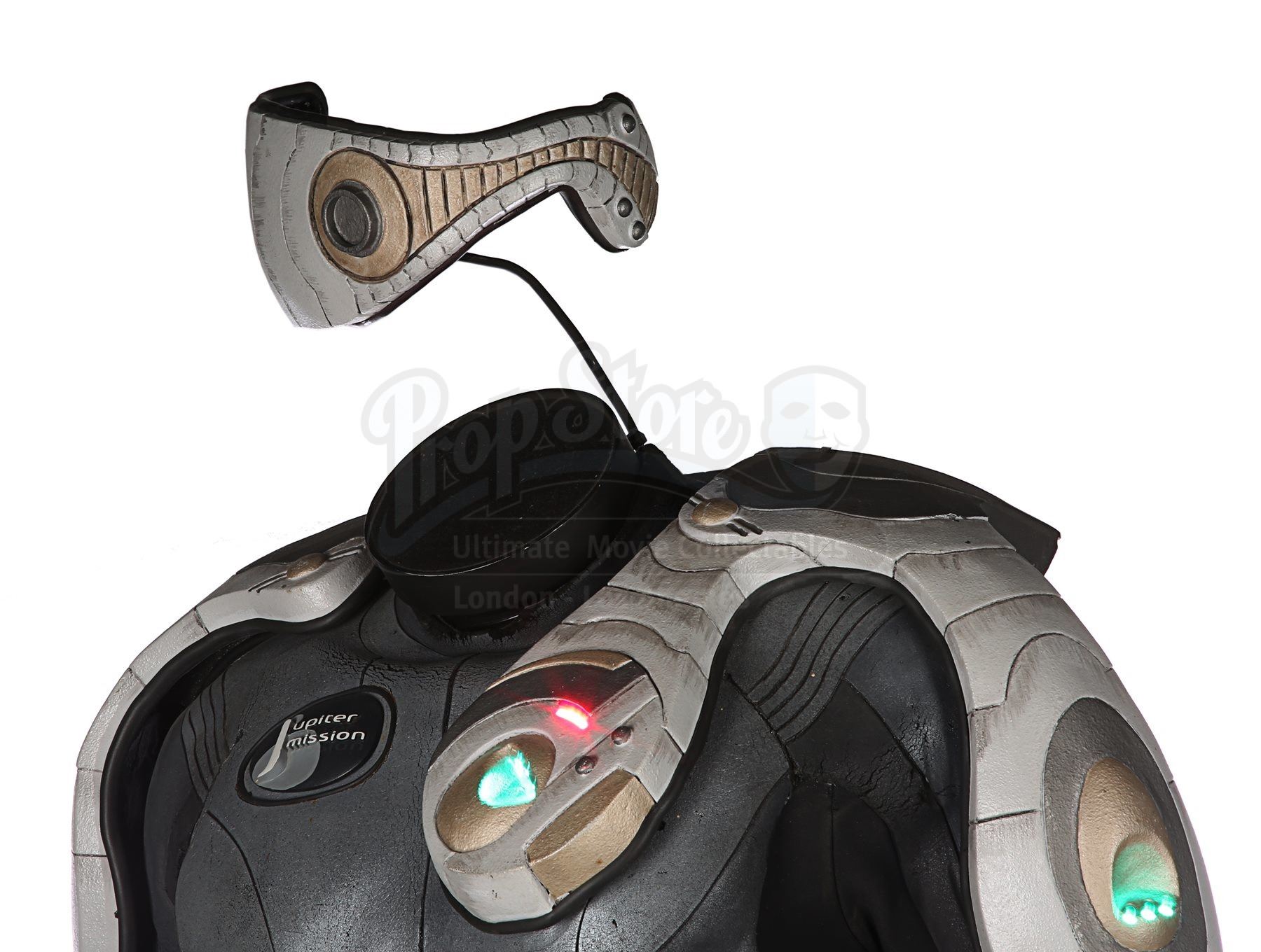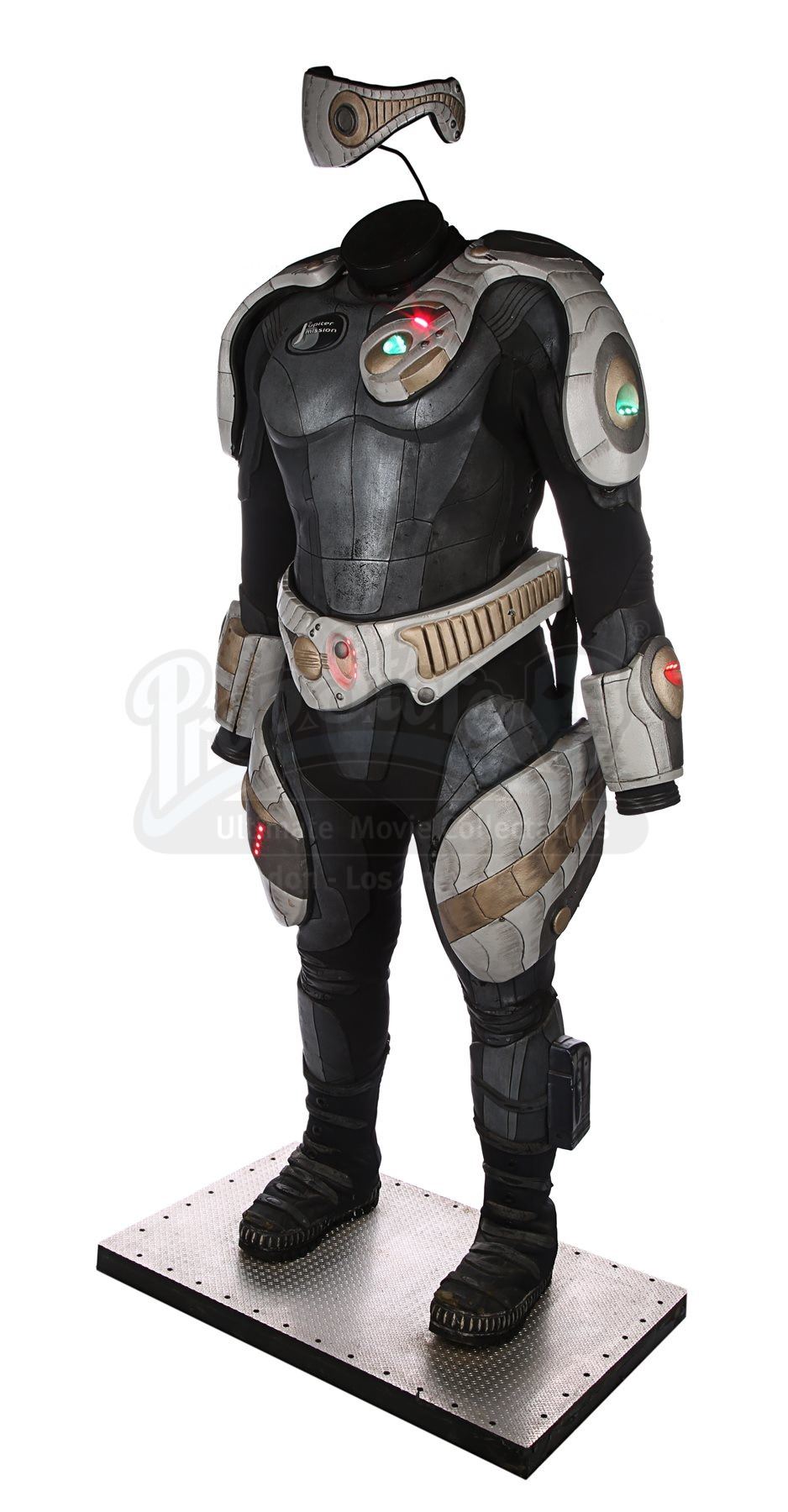 Cast-in detailing and a combination of small red and green LEDs are incorporated into the plastic pieces, powered by a 6-volt plug located in a compartment on the left side of the suit’s custom-made mannequin display. The display has a chromed tread-plate base. The rubber elements of the costume show minor wear. Dimensions (suit display): 34 cm x 65 cm x 167 cm (13 ½” x 25 ¼” x 63”)