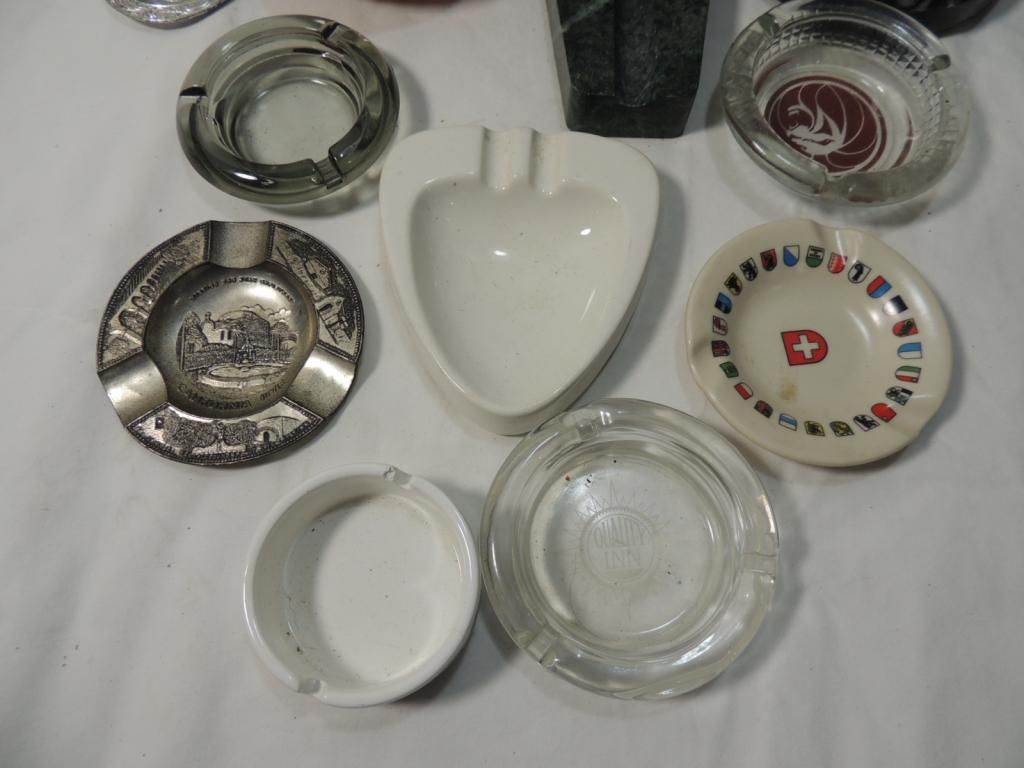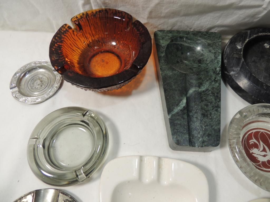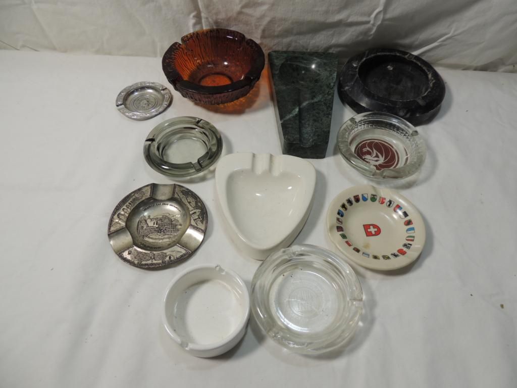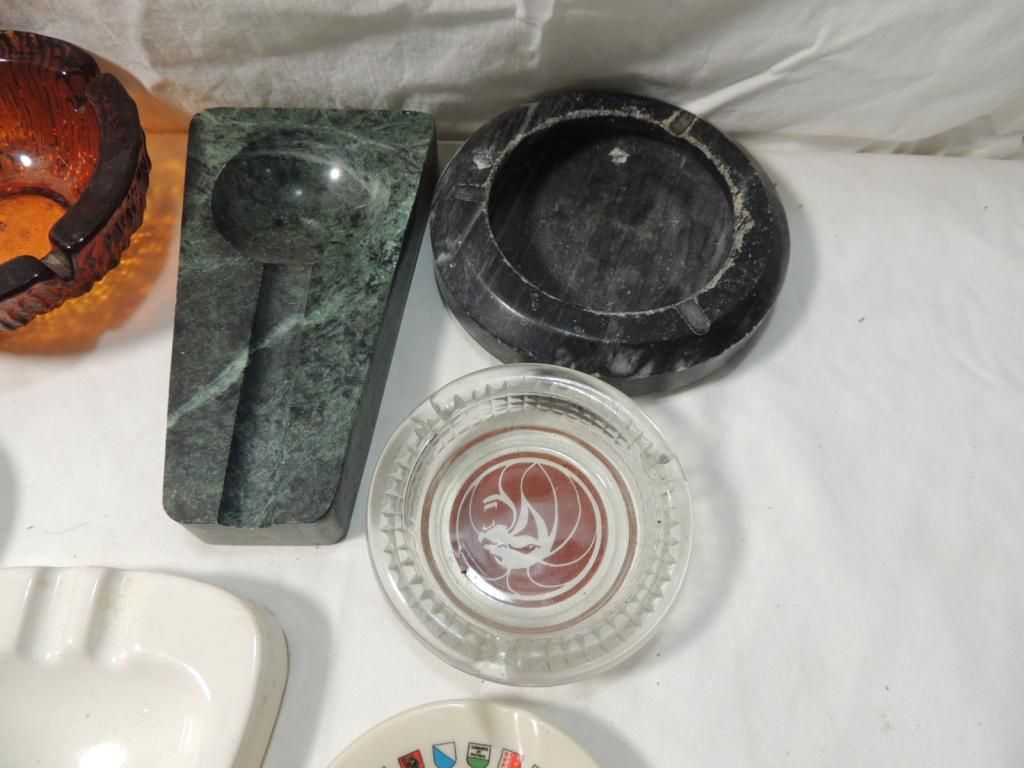 ASSORTED ASH TRAYS GLASS SLATE, MARBLE, GLASS, CERAMIC, METAL. AS SHOWN. SEE PHOTO FOR MORE DETAILS.