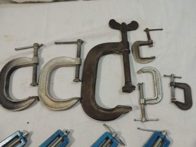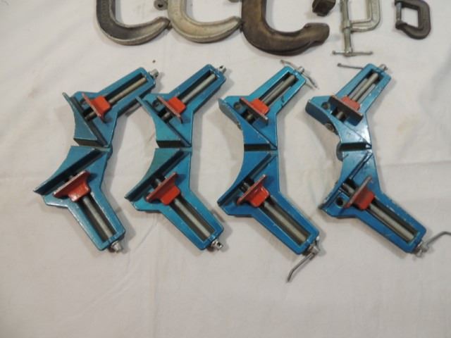 CORNER CLAMPS, C CLAMPS, VARIOUS SIZES, WOOD WORKING, SHOP, HAND TOOLS, COLLECTIBLE AS SHOWN SEE PHOTO FOR MORE DETAILS.