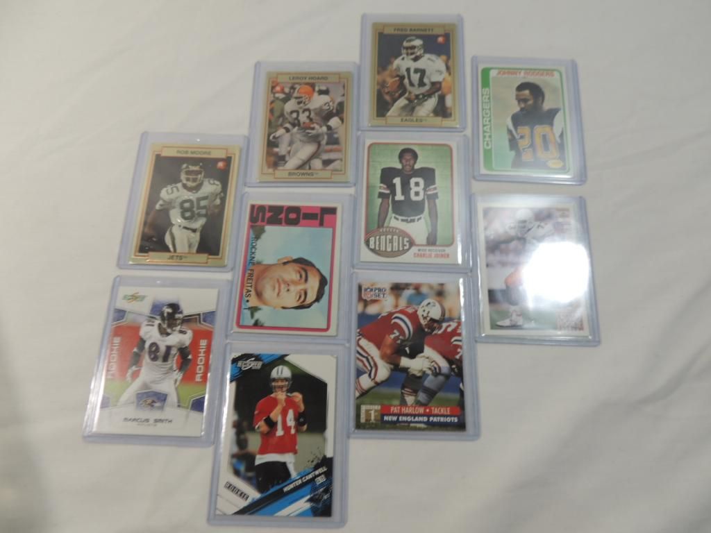 FOOTBALL PLAYER CARDS. FOOTBALL TRADING CARDS. COLLECTIBLE. FOOTBALL MEMORABILIA, MIXED DATES AND MIXED MAKERS. PROTECTIVE PLASTIC SLEEVES. AS SHOWN SEE PHOTO FOR MORE DETAILS.