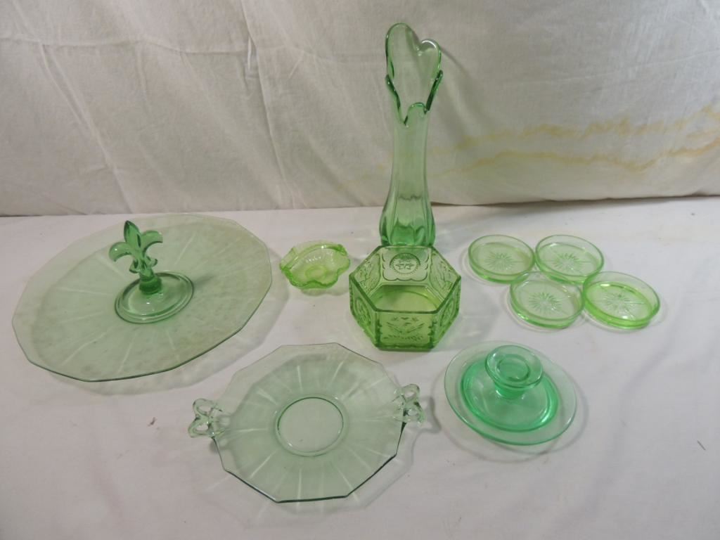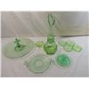 VASELINE GLASS URANIUM GLASS DEPRESSION GLASS GREEN GLASS CANDLE HOLDER, BOWL, DIP TRAY, TRAY, PLATE, VASE. VINTAGE GLASSWARE AS SHOWN SEE PHOTO FOR MORE DETAILS.