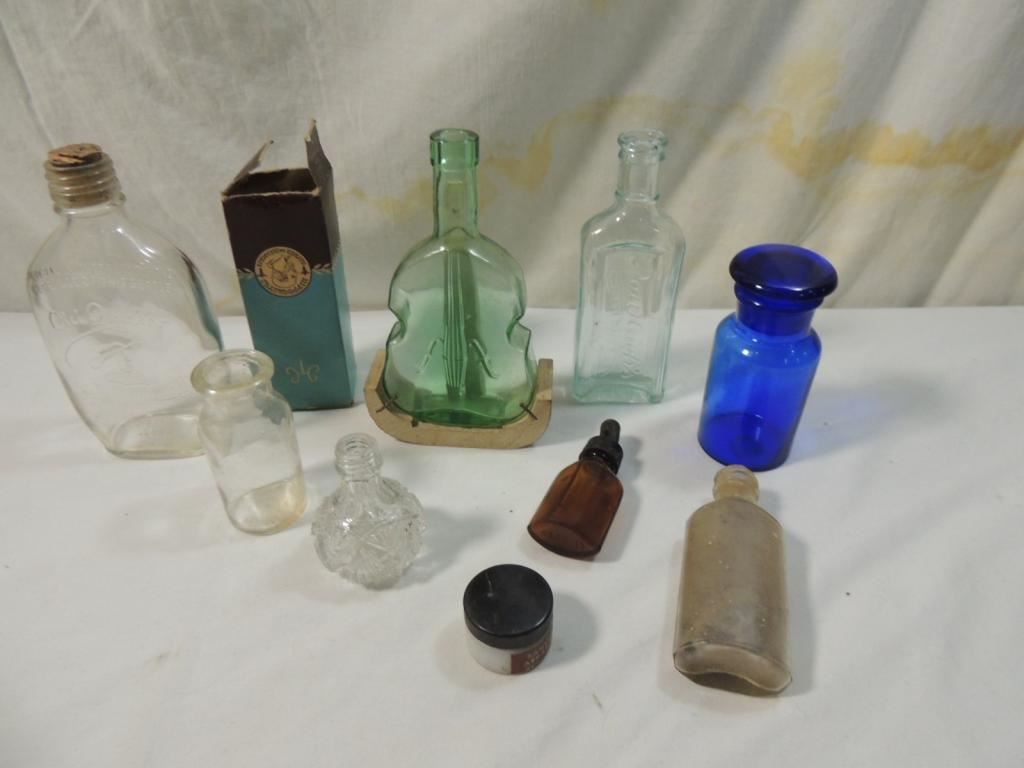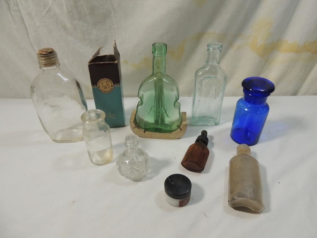VINTAGE BOTTLES, UNIQUE BOTTLES, VINTAGE BOTTLES, GLASS BOTTLES AS SHOWN SEE PHOTO FOR MORE DETAILS.