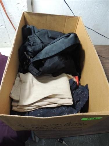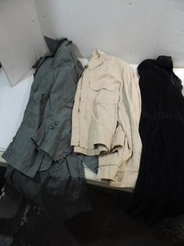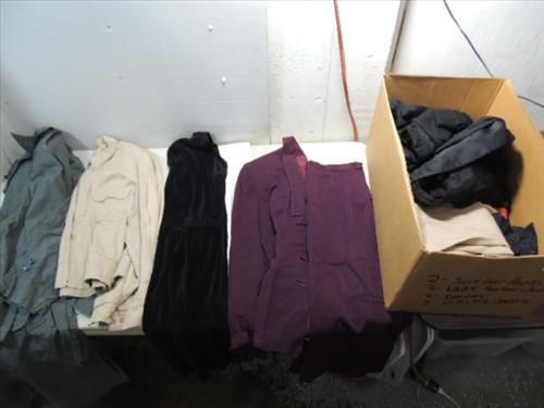 LOT 10 ASSORTED VINTAGE COLTHES: 4 DRESSES, 2 SPRING JACKETS, 2 MENS SUIT COAT & PANTS & 2 LADYS SUIT COAT AND SLACKS. AS SHOWN. VIEW PICTURE FOR DETAIL.