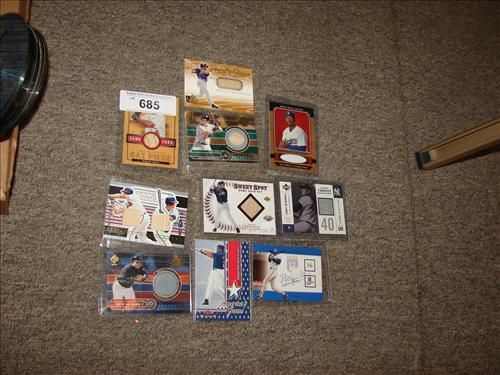 LOT INCLUDES: UPPER DECK BRIAN COLE GAME USED BAT CARD, TOPPS FUSION SMOLTZ / GLAVINE GAME USED BAT CARD, UPPER DECK SWEET SPOT ALEX RODRIGUEZ GAME USED BAT CARD, UPPER DECK TODD HELTON PIECE OF THE GAME BAT CARD, PACIFIC ERUBIEL DURAZO GAME USED BAT CARD, UPPER DECK LINDY MCDANIEL GAME WORN JERSEY CARD, FLEER THROUGH THE YEARS GAME WORN HOME JERSEY CARD, PACIFIC REY DROONEZ GAME WORN JERSEY CARD, FLEER RAFAEL PALMEIRO GAME WORN PANTS CARD, AND UPPER DECK LEGENDS GARY SHEFFIELD GAME WORN JERSEY CARD. AS SHOWN. VIEW PICTURE FOR DETAIL.