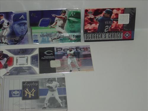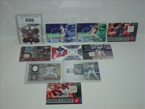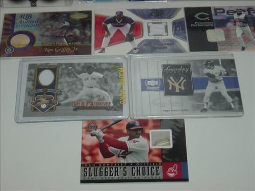 LOT INCLUDES: FLEER WALL OF FAME GREG MADDOX OUTFIELD WALL CARD, UPPER DECK SAMMY SOSA SPX WINNING MATERIALS JERSEY / BAT CARD, FLEER WALL OF FAME JASON GIAMBI OUTFIELD WALL CARD, UPPER DECK LEGENDARY LUMBER REGGIE JACKSON GAME USED BAT CARD, TOPPS GOLD LABEL KEN GRIFFEY JR. GAME USED BAT CARD, UPPER DECK JUAN DIAZ SPX PROSPECT JERSEY CARD, UPPER DECK PEDRO MARTINEZ GAME USED JERSEY CARD, UPPER DECK GOLD GLOVE RAFAEL PALMEIRO GAME USED BATTING GLOVE CARD, FLEER KEN GRIFFEY JR GAME USED BASE CARD, AND UPPER DECK SLUGGERS CHOICE JUAN GONZALEZ GAME USED BATTING GLOVE CARD. AS SHOWN. VIEW PICTURE FOR DETAIL.