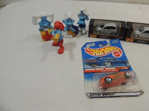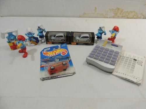 LOT 10 CHILDRENS TOYS: 6 SMURF FIGURES, HOT WHEEL,