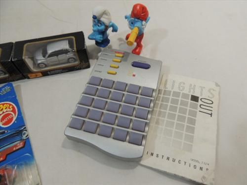 LOT 10 CHILDRENS TOYS: 6 SMURF FIGURES, HOT WHEEL, LIGHTS OUT ELECTRONIC GAME AND 2 MAISTO DIE CAST CARS. AS SHOWN. VIEW PICTURE FOR DETAIL.