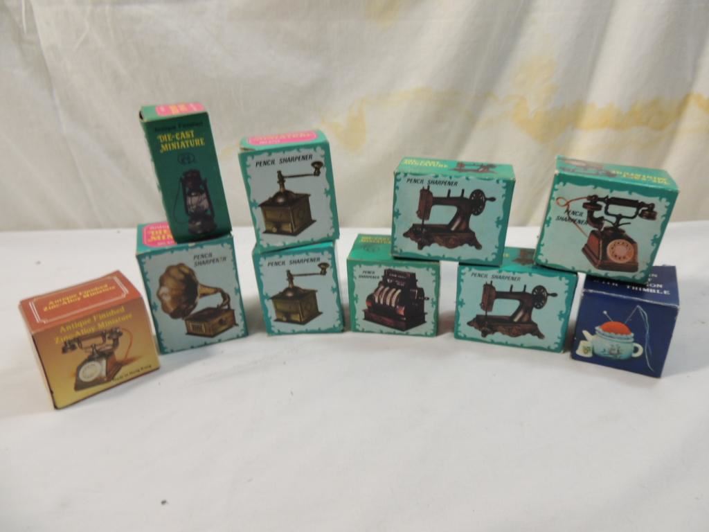 DIE CAST MINATURES STILL IN BOXES, DECORATIVE, TEA POT, PIN CUSHION, ANTIQUE FINISHED, DIE CAST SHARPNERS AS SHOWN SEE PHOTO FOR MORE DETAILS.