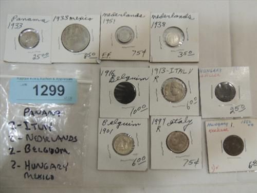 LOT 10 FOREIGN COINS: 2 BELGIUM, 2 ITALY, MEXICO, 2 NEDERLANDS & PANAMA. AS SHOWN. VIEW PICTURE FOR DETAIL.,