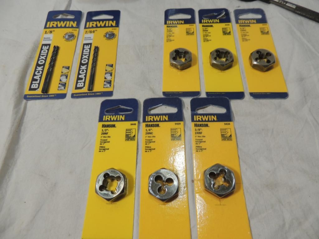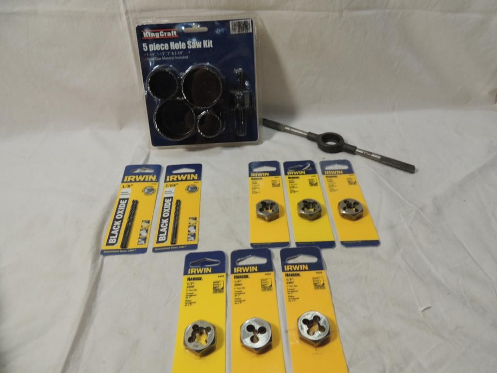 KING CRAFT 5 PIECE HOLD SAW KIT IRWIN DRILL BITS. IRWIN HANSON HEX DIE IN ASSORTED SIZES. AS SHOWN SEE PHOTO FOR MORE DETAILS.