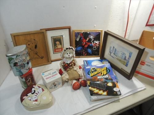 LOT 10 ITEMS: 3 PRESSED TINS, 1 MICKEY MOUSE MUG, 3 FRAMED PRINTS & 2 VINTAGE 1995 DIGITAL COMPUTER GAMES. AS SHOWN. VIEW PICTURE FOR DETAIL.