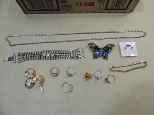 LOT 10 PIECES OF JEWELRY: 2 STERLING SILVER, RING, RHINESTONE (2) BRACELET, NECKLACE, BROACH & PIN. AS SHOWN. VIEW PICTURE FOR DETAIL.