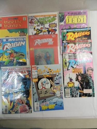 LOT 10 SILVER AGE COMIC BOOKS: CHARLTON, MARVEL, DC. BEETLE BAILEY, SPIDER-MAN, JEDI, ROBIN AND MORE. AS SHOWN. VIEW PICTURE FOR DETAIL.