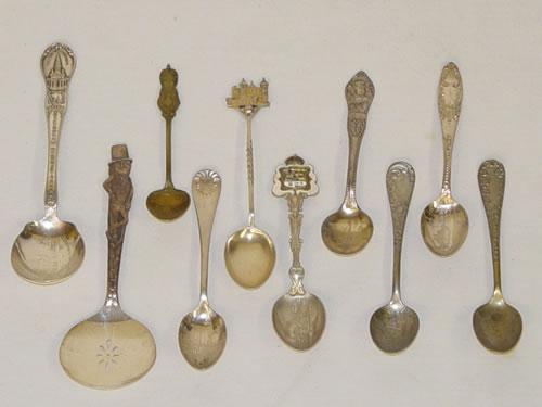 LOT (10) SOUVENIR SPOONS: (2) STERLING & (8) SILVERPLATED INCLUDING MR. PEANUT, MONTREAL, REMEMBER THE MAINE, 1915 PANORAMA PACIFIC EXPOSITION, ETC. - WEAR