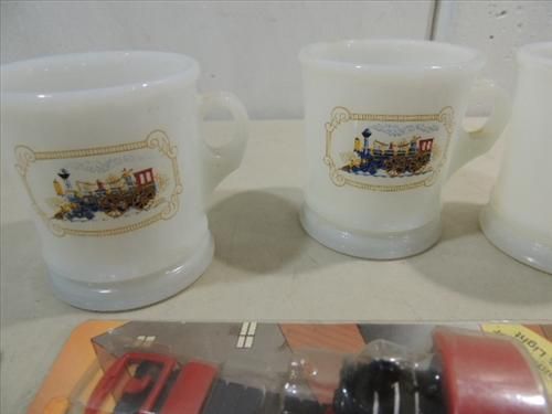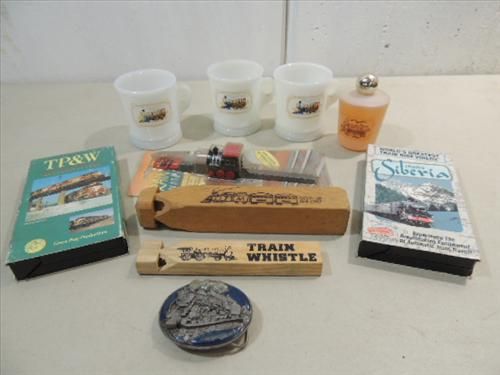 LOT 10 TRAIN REALTED COLLECTIBLES: WOOD WHISTLES, 3 MUGS, 2 VHS VIDEOS, BELT BUCKLE AND COLOGNE. AS SHOWN. VIEW PICTURE FOR DETAIL.