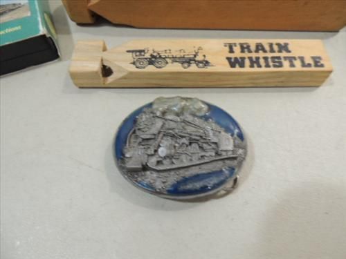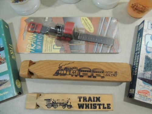 LOT 10 TRAIN REALTED COLLECTIBLES: WOOD WHISTLES,