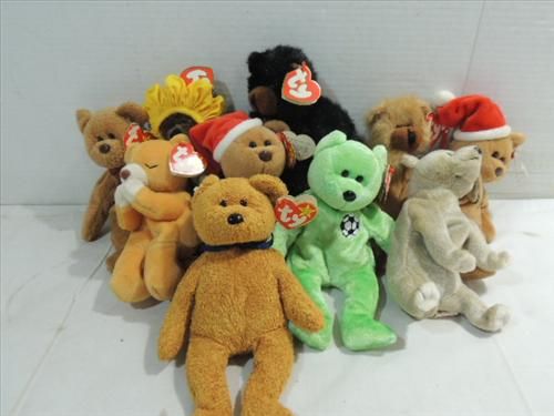 LOT 10 TY PLUSH BEANIE BABIES: HOPE, TEDDY, FUZZ, KICKS AND MORE. AS SHOWN. VIEW PICTURE FOR DETAIL.