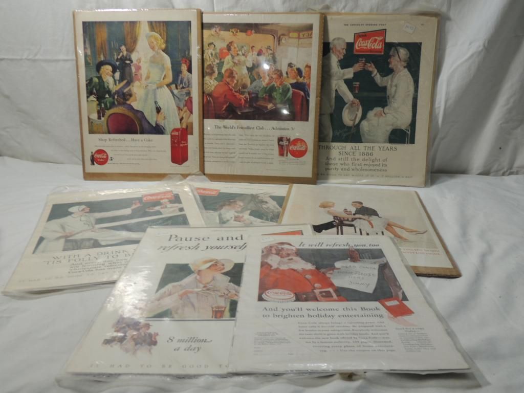 COCA COLA ADVERTISEMENTS VINTAGE ADS. IN PLASTIC. GREAT FOR FRAMING AS SHOWN. SEE PHOTO FOR MORE DETAILS.