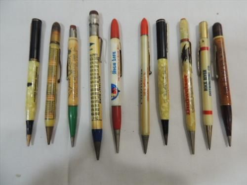 LOT 10 VINTAGE MECHANICAL BUSINES ADVERTISING PENCILS. MILLER HIGH LIFE, BUDWEISER, TRI-STATE BEVERAGE, AND MORE. AS SHOWN. VIEW PICTURE FOR DETAIL.