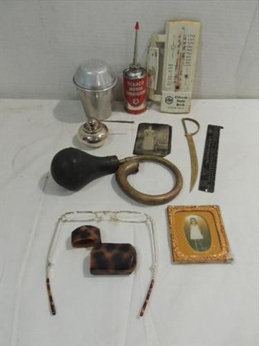 LOT 10 VINTAGE MIXED GROUP: OLD BRASS HORN, HEMO MALT SHAKER, PRESSED METAL THERMOMETER, BAKELITE FOLDING GLASSES, TEXACO OIL CAN, RULER AND MORE. AS SHOWN. VIEW PICTURE FOR DETAIL.