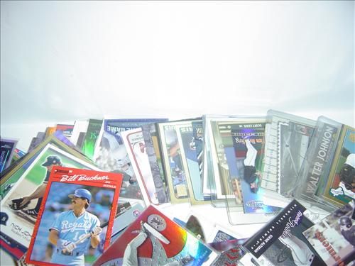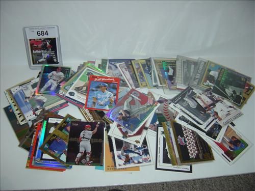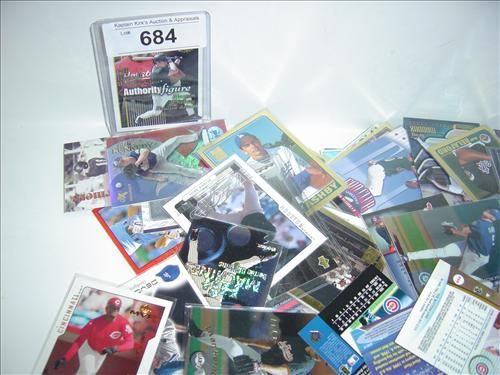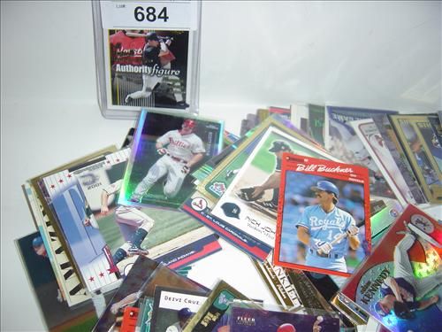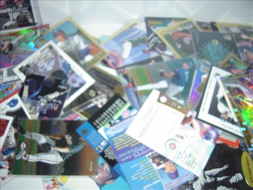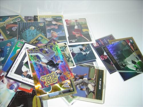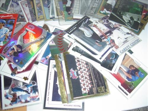 LOT OF 100+ BASEBALL CARDS INCLUDING CARDS LIKE: FLEER #SR170 DAVID JUSTICE, TOPPS #638 AL FITZMORRIS, UPPER DECK #X28 SAMMY SOSA, TOPPS AMERICAN PIE #78 SAM MCDOWELL, UPPER DECK CENTURY LEGENDS #111 VLADIMIR GUERRERO, AND MANY MORE. AS SHOWN. VIEW PICTURE FOR DETAIL.