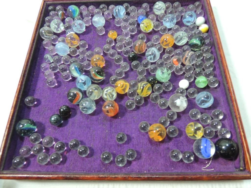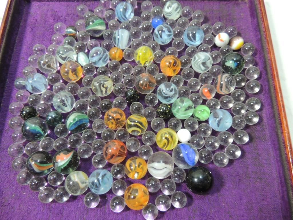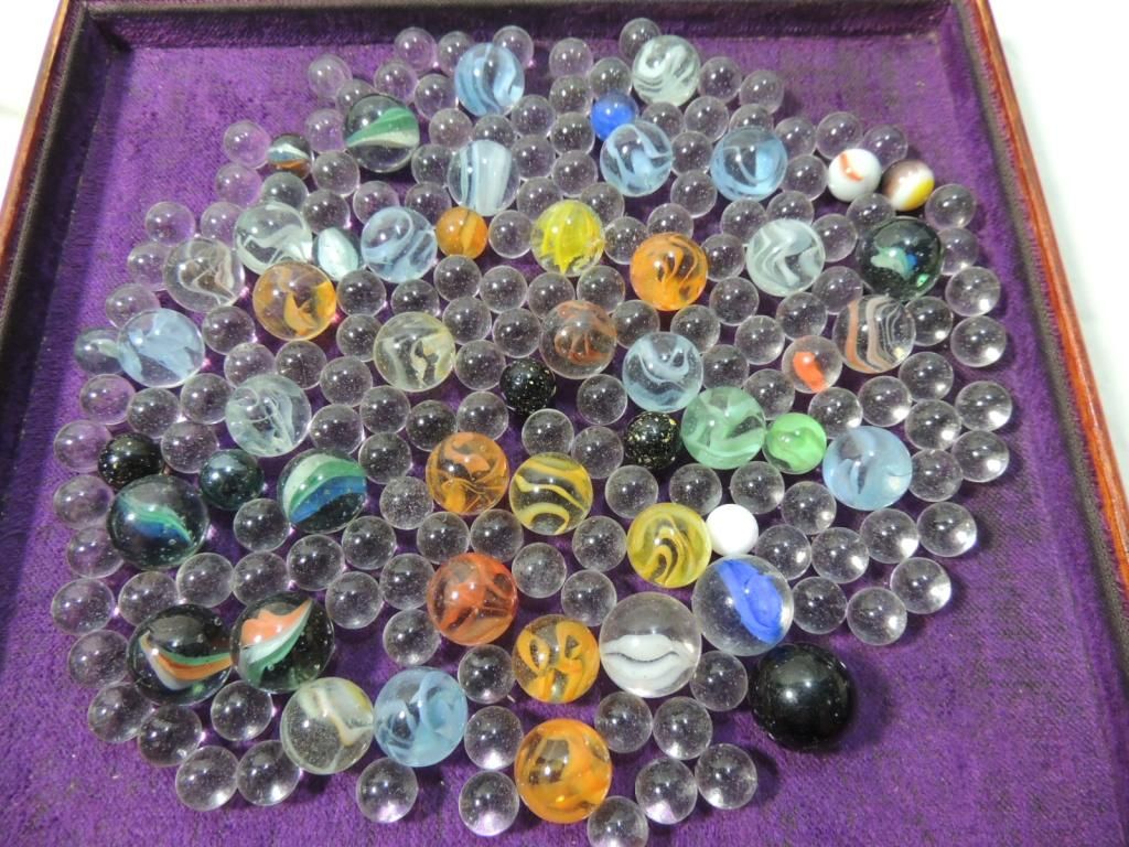 37 SHOOTERS & ASSORTED MARBLES VINTAGE MARBLES. AS SHOWN. SEE PHOTO FOR MORE DETAILS.