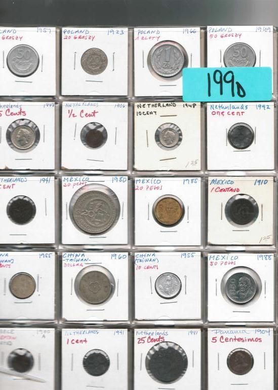 LOT OF 100 FOREIGN COINS INCLUDING 1957 POLAND 50 GROSZY, 1955 CHINA (TAIWAN) 10 CENTS, 1878 NETHERLANDS CENT, 1895 HUNGARY 10 FILLER, AND MORE. AS SHOWN. VIEW PICTURE FOR DETAIL.