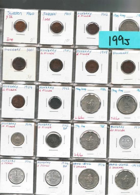 LOT OF 100 FOREIGN COINS INCLUDING: 1905 SWEDEN 1 ORE, 1980 HONG KONG 5 DOLLARS, 1942BP HUNGARY 10 FILLER, 1944BP HUNGARY PENGO, 1982 KOREA 100 WON, 1962 PANAMA 5 CENTESIMOS, AND MORE. AS SHOWN. VIEW PICTURE FOR DETAIL.