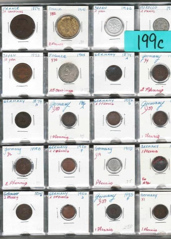 LOT OF 100 FOREIGN COINS INCLUDING: 1953 JAPAN 10 YEN, 1941A GERMANY 1 PFENNIG, 1973 IRELAND A KRONA, 1964 VIETNAM 10 DONG, 1940 ITALY LIRE, AND MANY MORE. AS SHOWN. VIEW PICTURE FOR DETAIL.