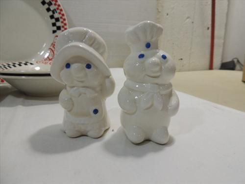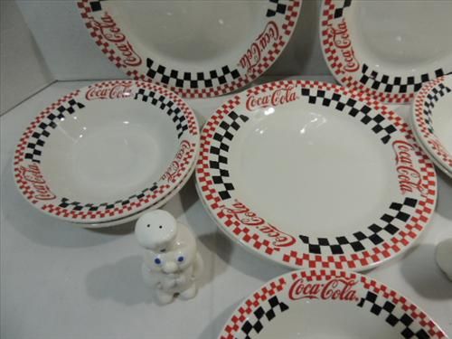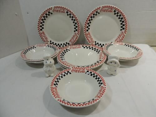 LOT 11 (9) COCA-COLA SODA FOUNATAIN PLATES & BOWLS, PAIR SALT & PEPPER PILLSBURY DOUGH BOY SHAKERS. AS SHOWN. VIEW PICTURE FOR DETAIL.
