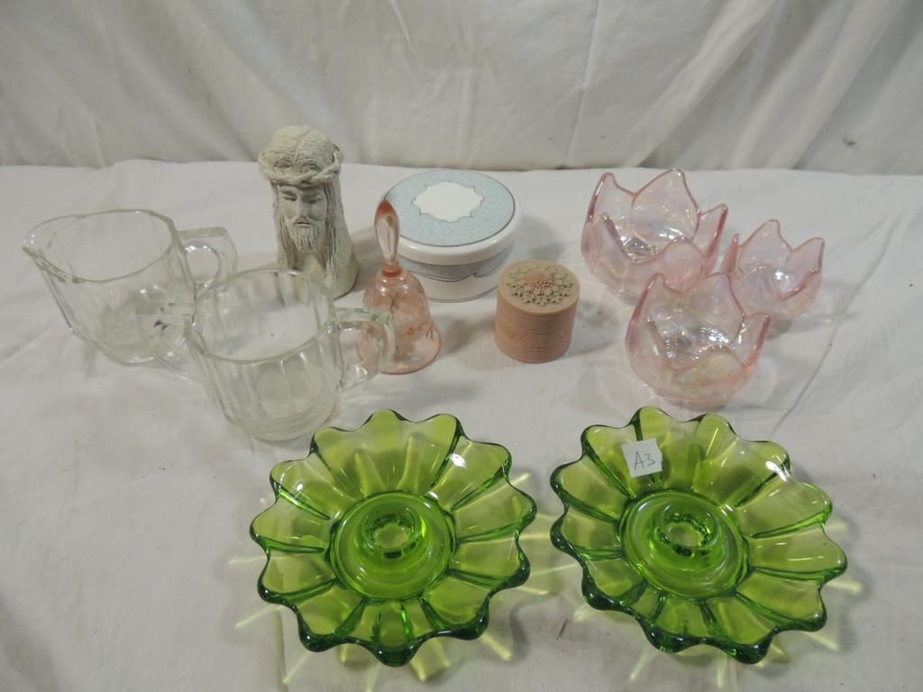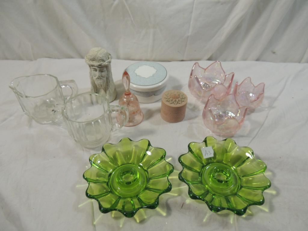 TRINKET BOXES, GLASS CANDLE HOLERS, VINTAGE GLASS, AS SHOWN SEE PHOTO FOR MORE DETAILS