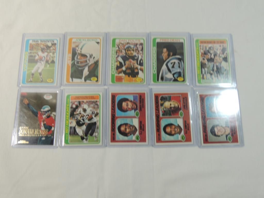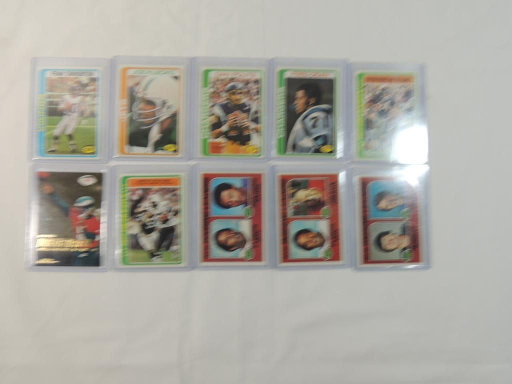 LOT 11 FOOTBALL CARDS. ASSORTED TEAMS AND PLAYERS. SEE PICTURE FOR DETAILS. AS SHOWN.