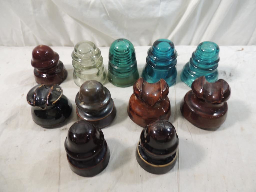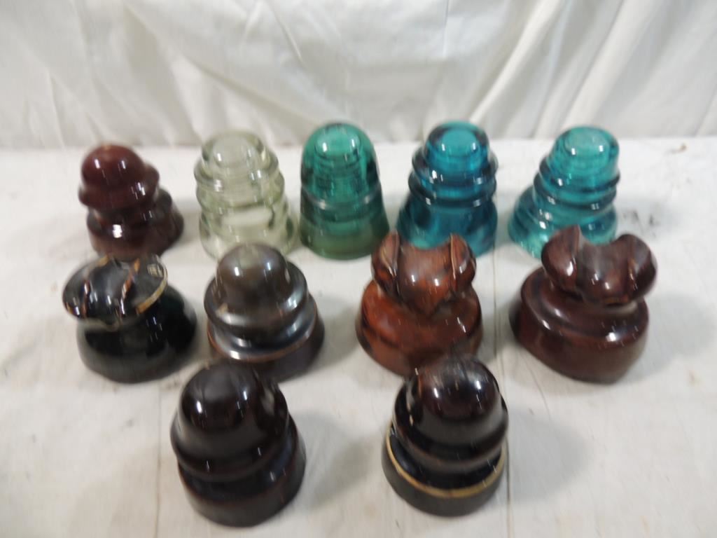 BLUE GLASS, CLEAR GLASS, CERAMIC BROWN GLAZE INSULATORS, COLLECTIBLE ASSORTED STYLES AS SHOWN SEE PHOTO FOR MORE DETAILS.