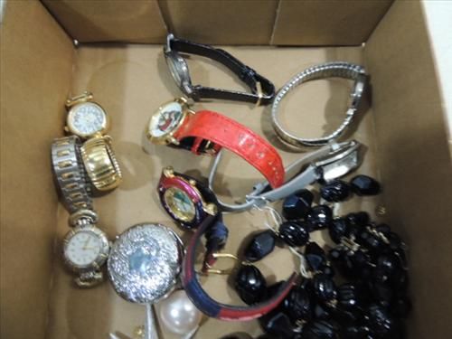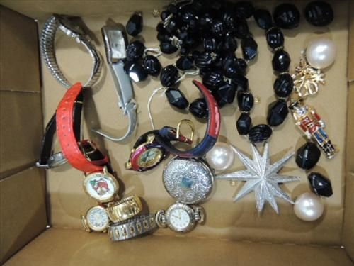 LOT 11 ASSORTED LADYS JEWELRY: 7 QUARTZ WRIST WATCHES AND MORE.  AS SHOWN.  VIEW PICTURE FOR DETAIL.