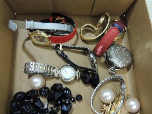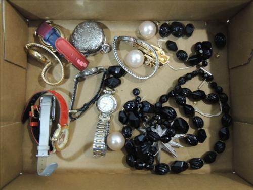 LOT 11 ASSORTED LADYS JEWELRY: 7 QUARTZ WRIST WATCHES AND MORE. AS SHOWN. VIEW PICTURE FOR DETAIL.
