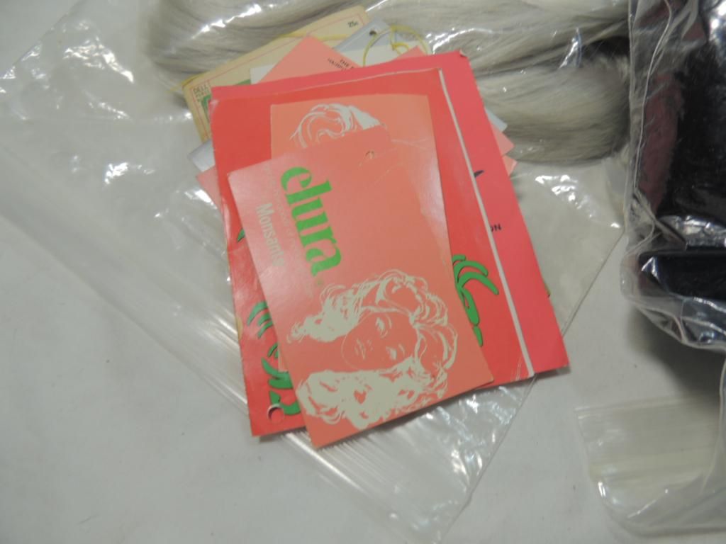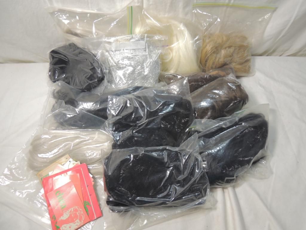 ASSORTED WIGS BROWN BLONDE SILVER, WHTIE, MEDIUM LENTGH AND SHORT LENGTH TAGS INCLUDED. AS SHOWN. SEE PHOTO FOR MORE DETAILS.