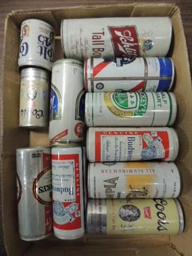 LOT 11 BREWERIANA ASSORTED SIZE PULL TOP BEER CANS. COORS, SCHILTZ, OLYMPIA, PBR AND MORE. AS SHOWN. VIEW PICTURE FOR DETAIL.
