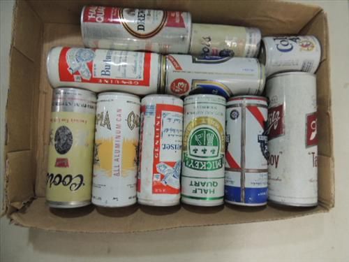 LOT 11 BREWERIANA ASSORTED SIZE PULL TOP BEER CANS. COORS, SCHILTZ, OLYMPIA, PBR AND MORE. AS SHOWN. VIEW PICTURE FOR DETAIL.
