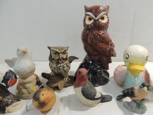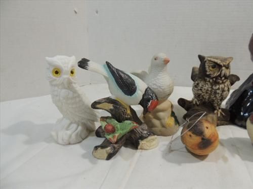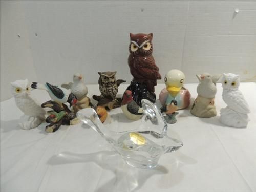 LOT 11 CERAMIC & GLASS BIRDS, SEVERAL OWLS, DOVES & MORE. AS SHOWN. VIEW PICTURE FOR DETAIL.