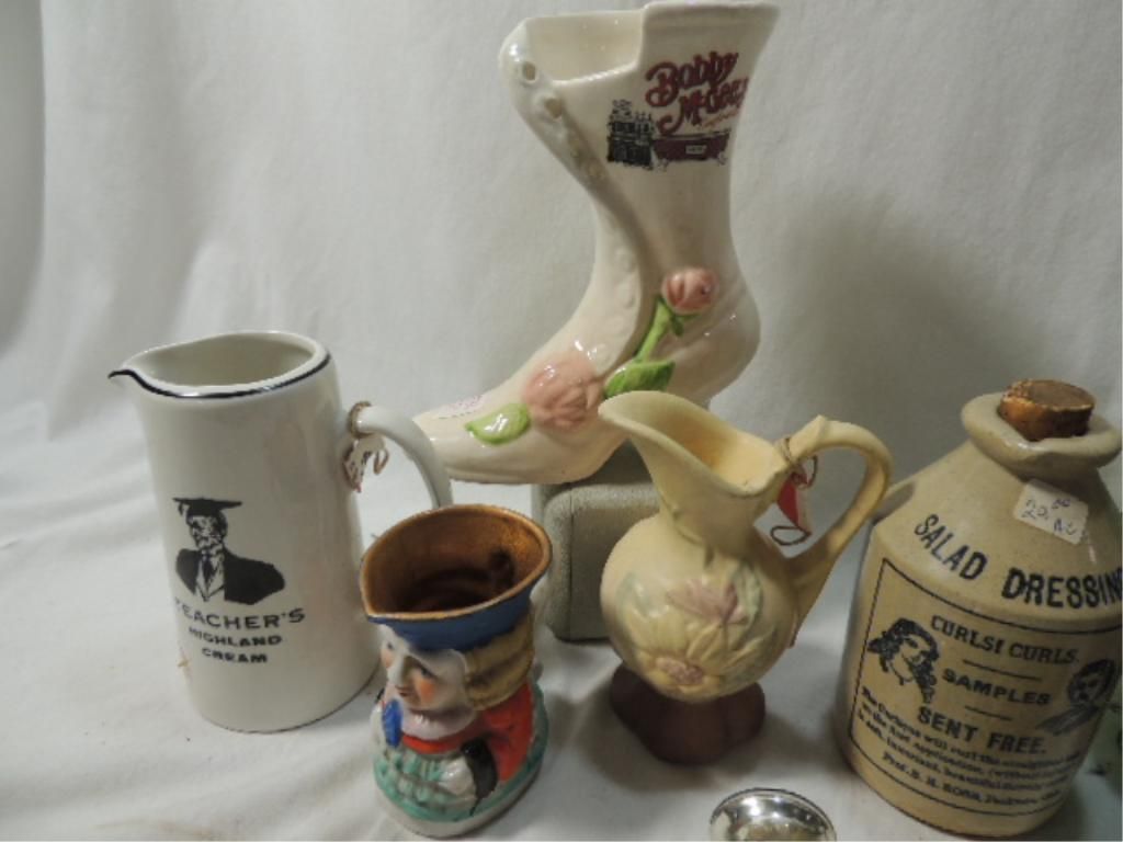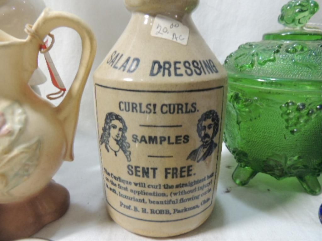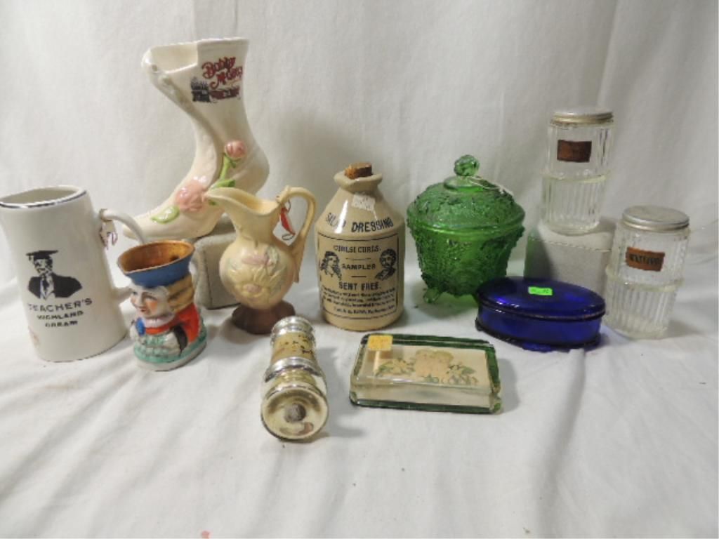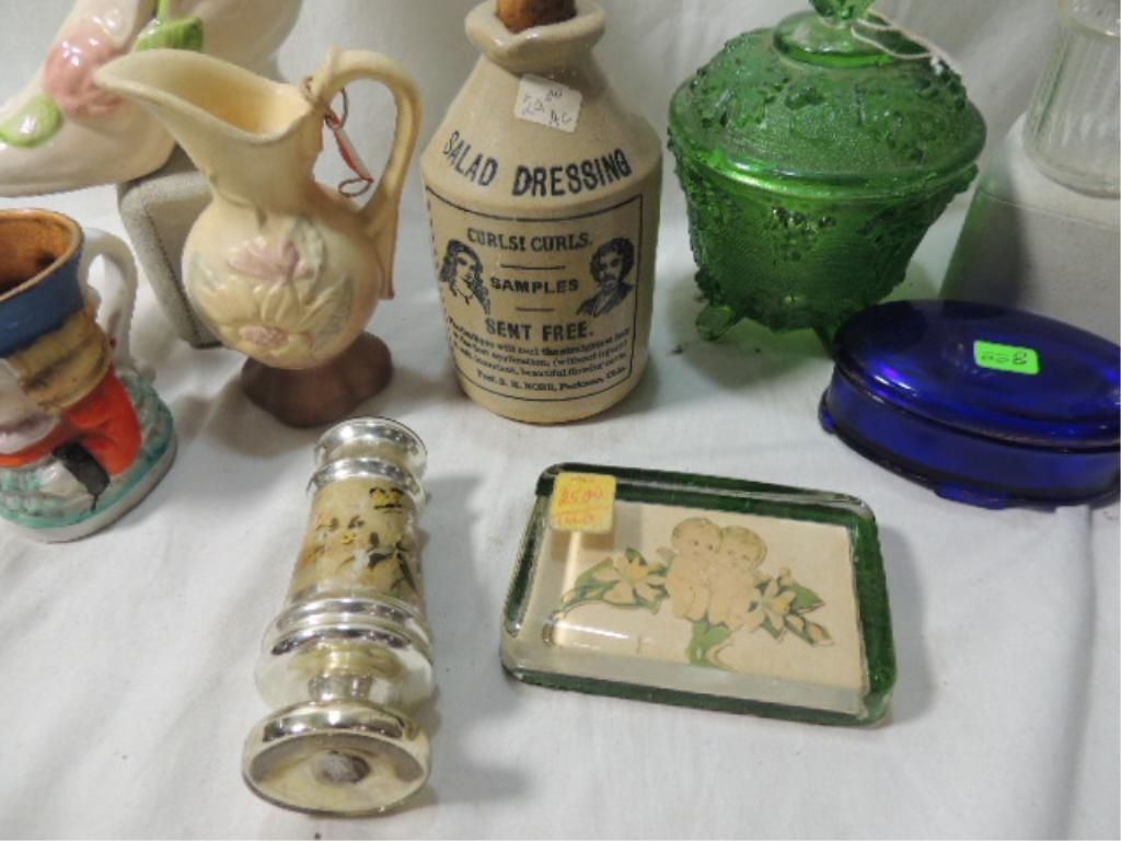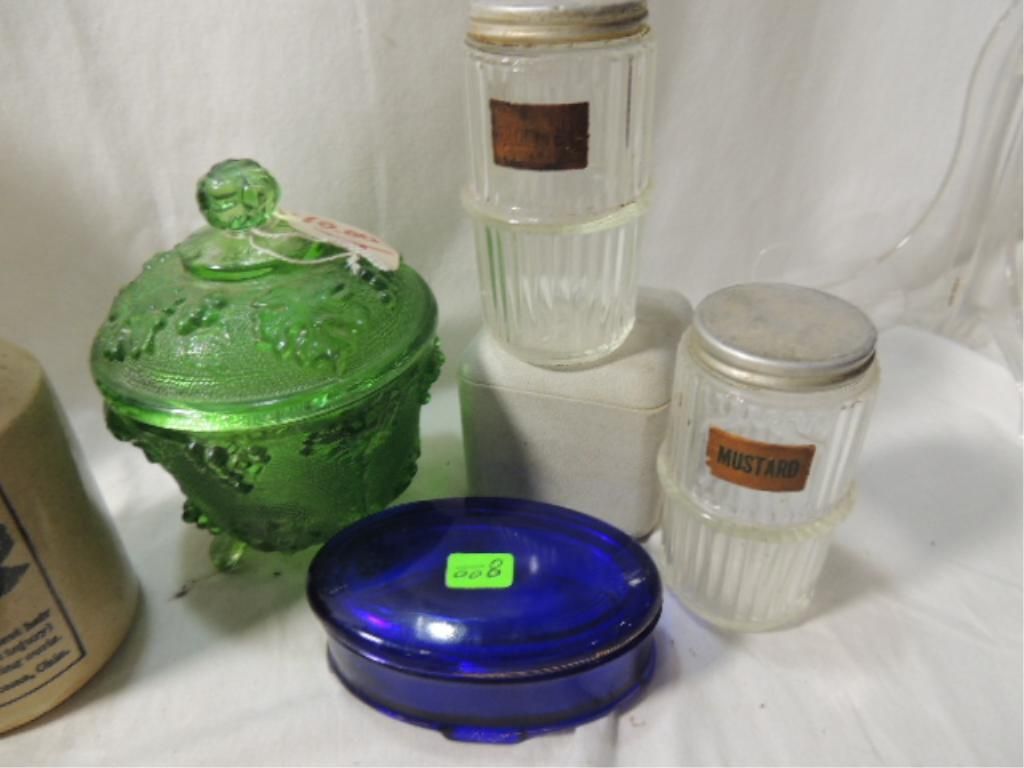 MIXED ITEMS. VINTAGE PAPERWEIGHT, MERCURY GLASS, GLASS VINTAGE MUSTARD CONTAINERS, GLASS DISHES WITH LID, VINTAGE SALAD DRESSING CERAMIC JAR, AS SHOWN. SEE PHOTO FOR MORE DETAILS.