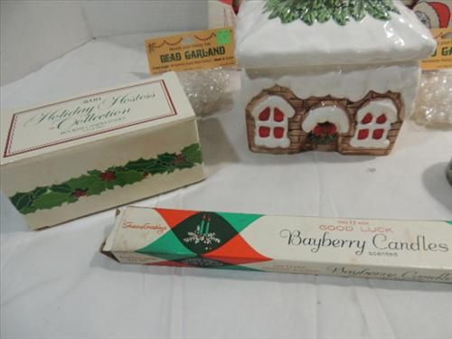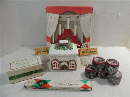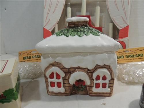 LOT 11 HOLIDAY ITEMS: COOKIE JAR, ELECTRIC CANDLE SET, BEADED GARLAND, METAL TINS. A SSHOWN. VIEW PICTURE FOR DETAIL.