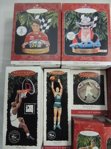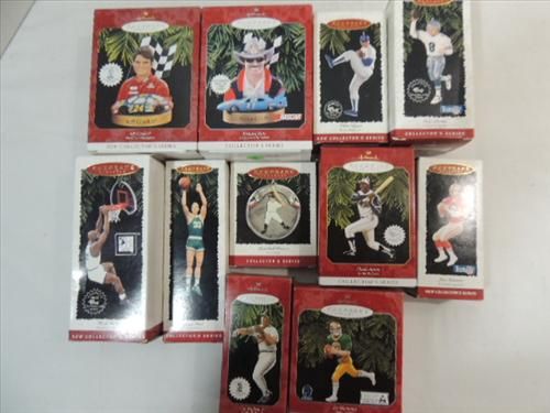 LOT 11 KEEPSAKE ASSORTED SPORTS ORNAMENTS: JEFF GORDON, HANK AARON, JOE MONTANA, TROY AIKMAN AND MANY MORE. AS SHOWN. VIEW PICTURE FOR DETAIL.