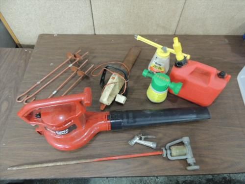 LOT 11 LAWN MAINTENANCE EQUIPMENT: TORO LEAF BLOWER, YARD FERTILIZER SPRAY GUNS, GAS CONTAINER, 4 LAWN STEAKS AND MORE. AS SHOWN. VIEW PICTURE FOR DETAIL.
