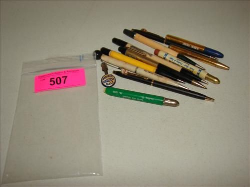 LOT OF 11 VINTAGE PENS AND MECHANICAL PENCILS. ADVERTISERS INCLUDES: KNAUS TRUCK LINES, JONES TRANSFER, ALBRENT FREIGHT, OWENSBORO PACKING CO, AND MORE. AS SHOWN. VIEW PICTURE FOR DETAIL.