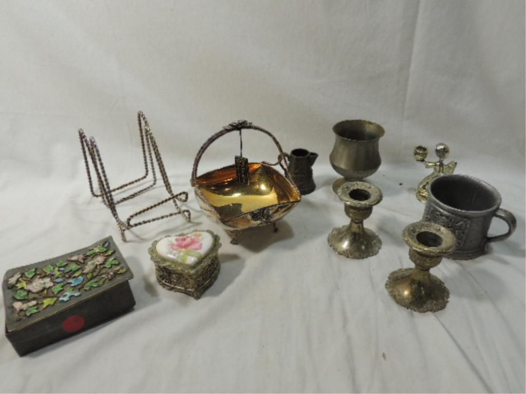 LOT 11 METAL COLLECTIBLES BOXES, CANDLE HOLDER, EC